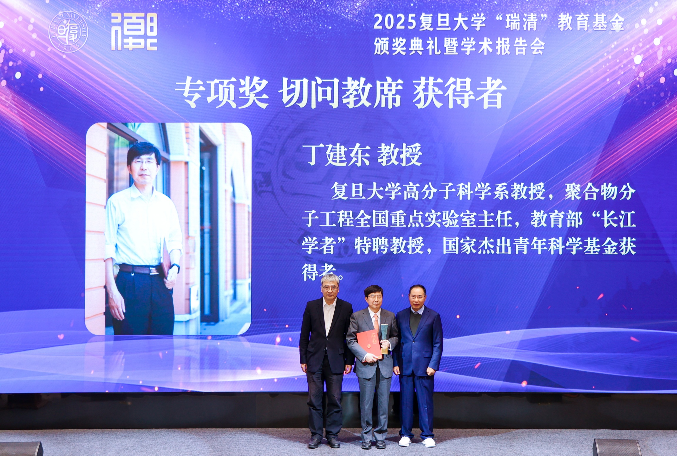 聚合物分子工程全国重点实验室主任、复旦大学高分子科学系教授丁建东获得2025年“瑞清”教育基金专项奖——切问教席。基金表彰其深耕分子设计到医疗器械的全链条创新,领衔创制可注射热致水凝胶与新型左心耳封堵器,为提升高端医疗器械自主创新做出了重要贡献。丁建东结合自己的研究经历,感谢成长历程中各位师长、历年的弟子以及海内外同行的支持,希望以二十年的坚守,努力实现国际首批次医药用原材料的产业转化。