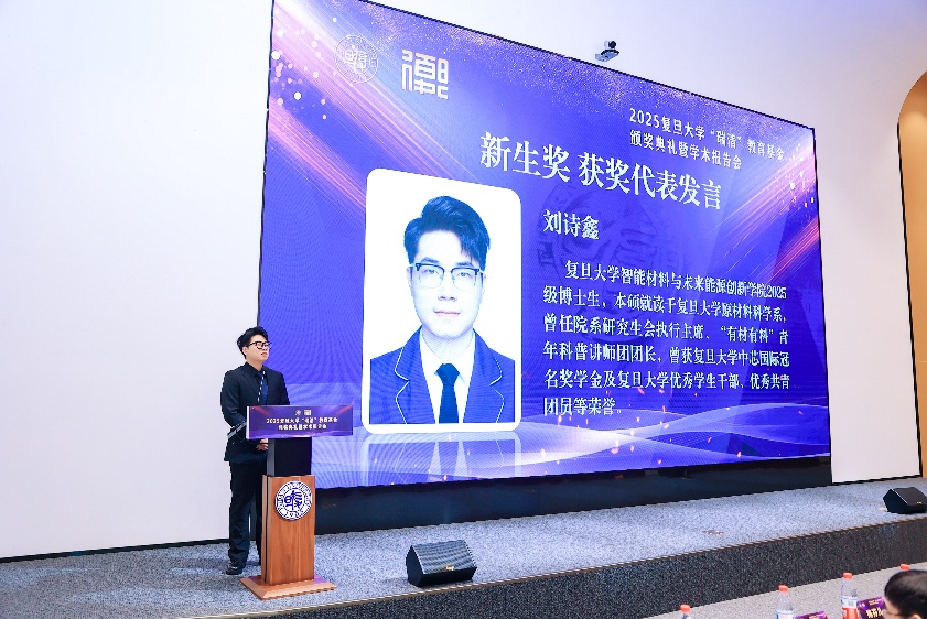 在复旦已度过七个春秋,刚刚开启博士生涯的智能材料与未来能源创新学院2025级博士生刘诗鑫同学代表全体获奖新生发言。“我的科研之路是从好奇走向坚定、从摸索走向专注的过程。”他引用汪国真的诗句与新生们共勉:“既然选择了远方,便无惧风雨兼程”。希望共同珍惜这份荣誉,在复旦的沃土上扎根生长,以探索之心追求真理,以创新之力回应时代!