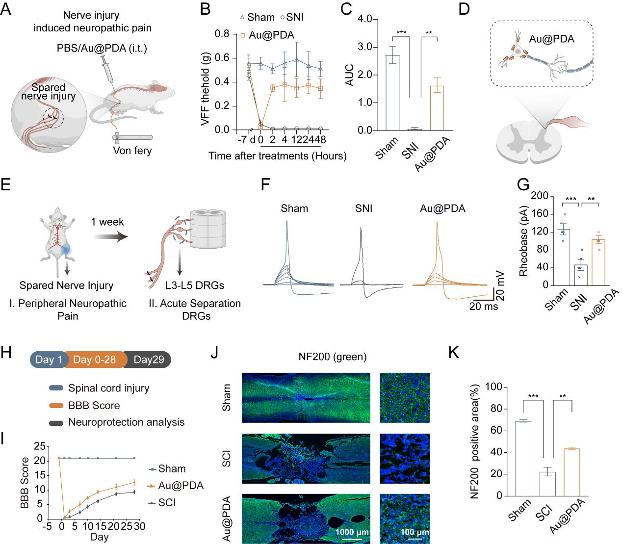 在动物模型中,该技术展现出显著的治疗潜力。在坐骨神经损伤模型中,通过降低神经元传递敏感性,有效逆转了疼痛敏化;在脊髓损伤模型中,则通过减轻兴奋性毒性,促进了神经功能的恢复(图3)。