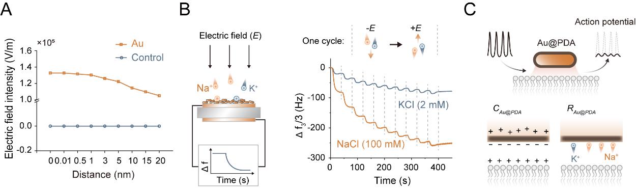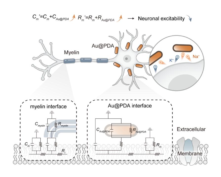 机制研究表明,Au@PDA在神经元表面附着形成拓扑界面后,相当于在神经元电路中“嵌入”耦合电容和串联电阻,显著改变膜的电学特性。研究人员将这一物理效应整合至经典神经电生理模型,从理论层面构建出“膜结构-信号编码”的物理调控新范式(图2)。